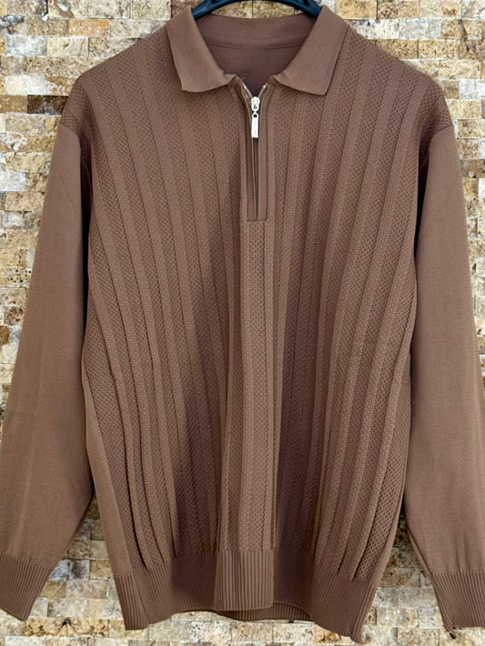 Erkek Polo Yaka Uzun Kollu Çizgili Kazak - Kahverengi