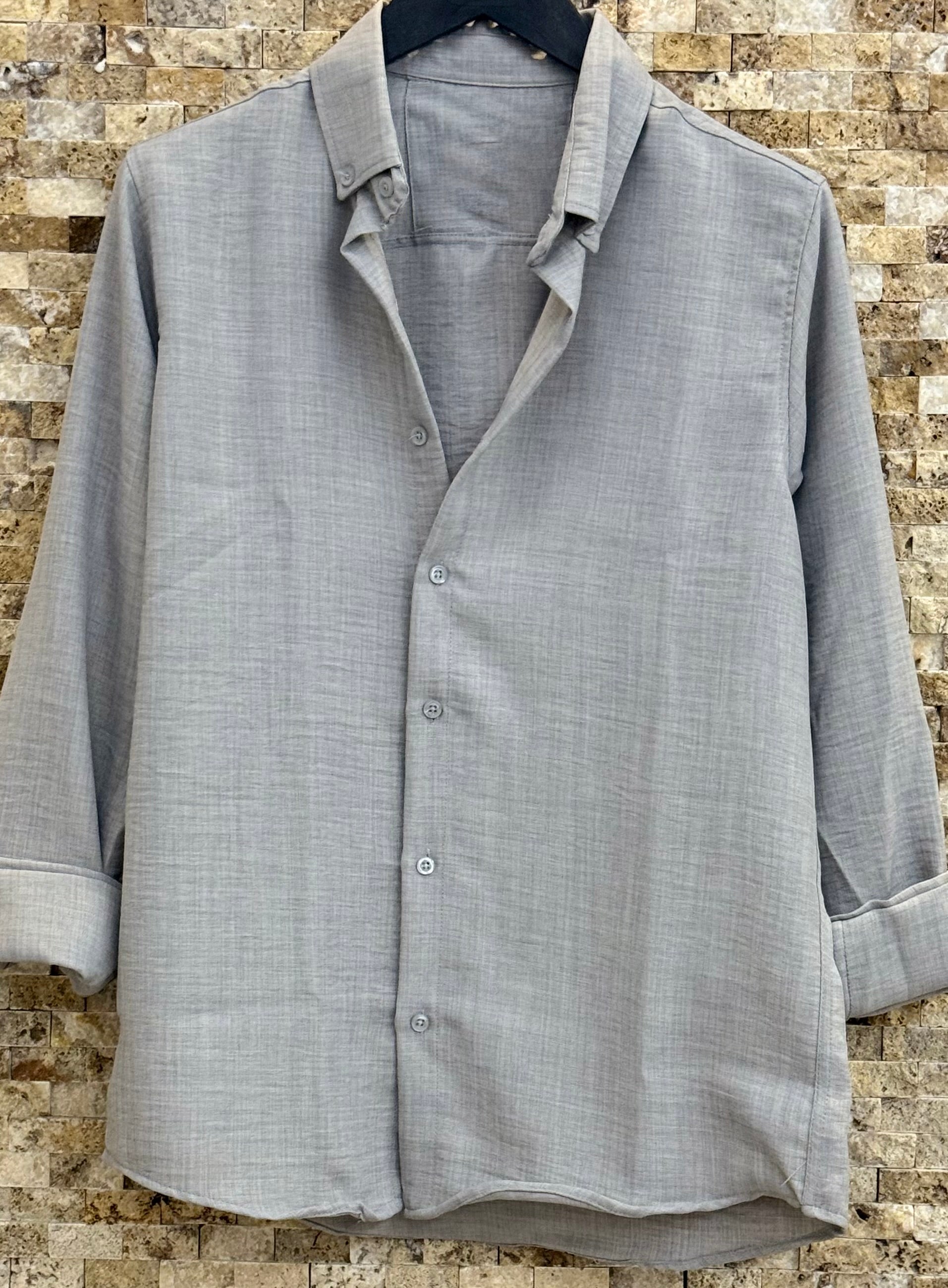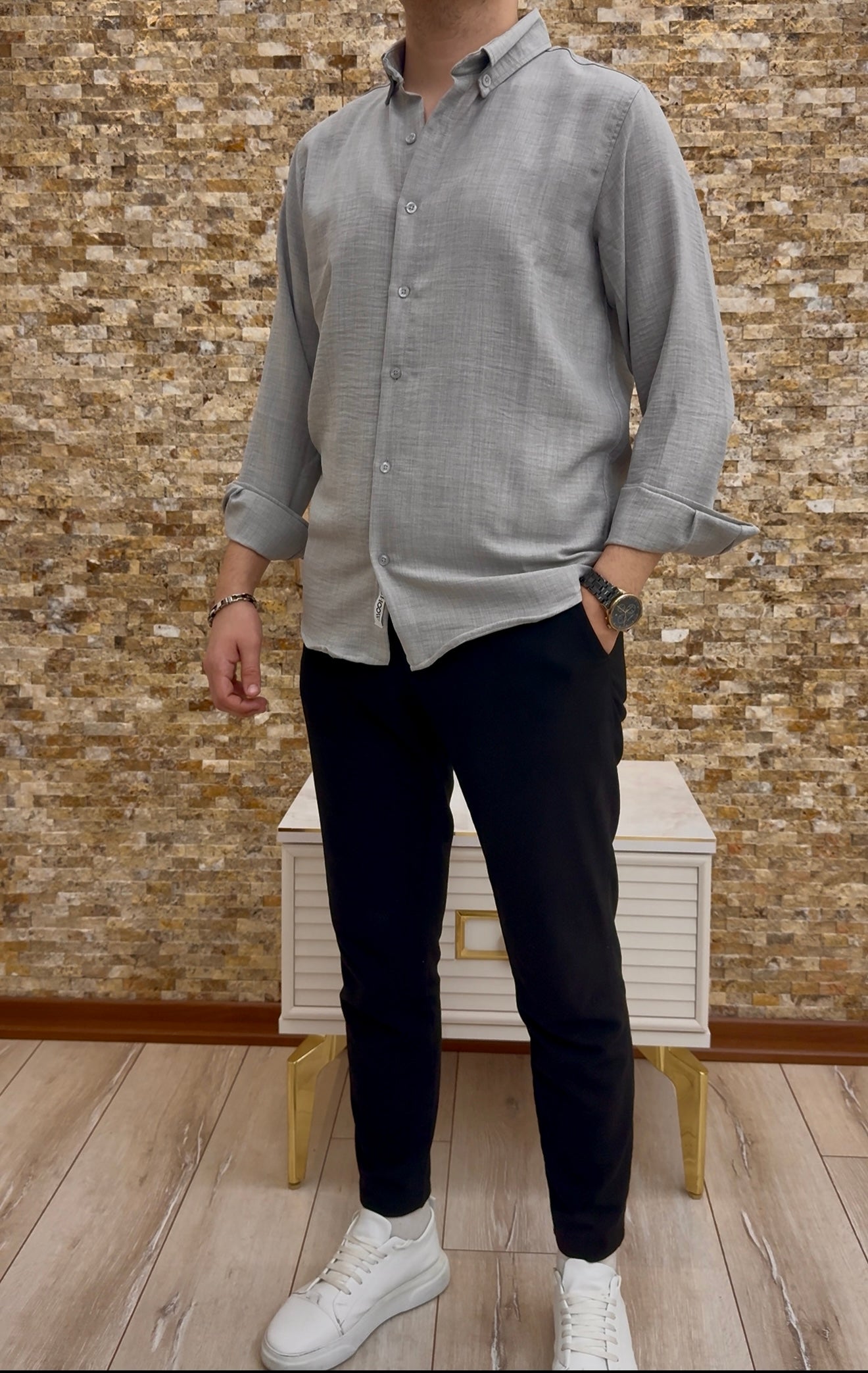 Erkek Keten Dokulu Gömlek - Açık Gri
